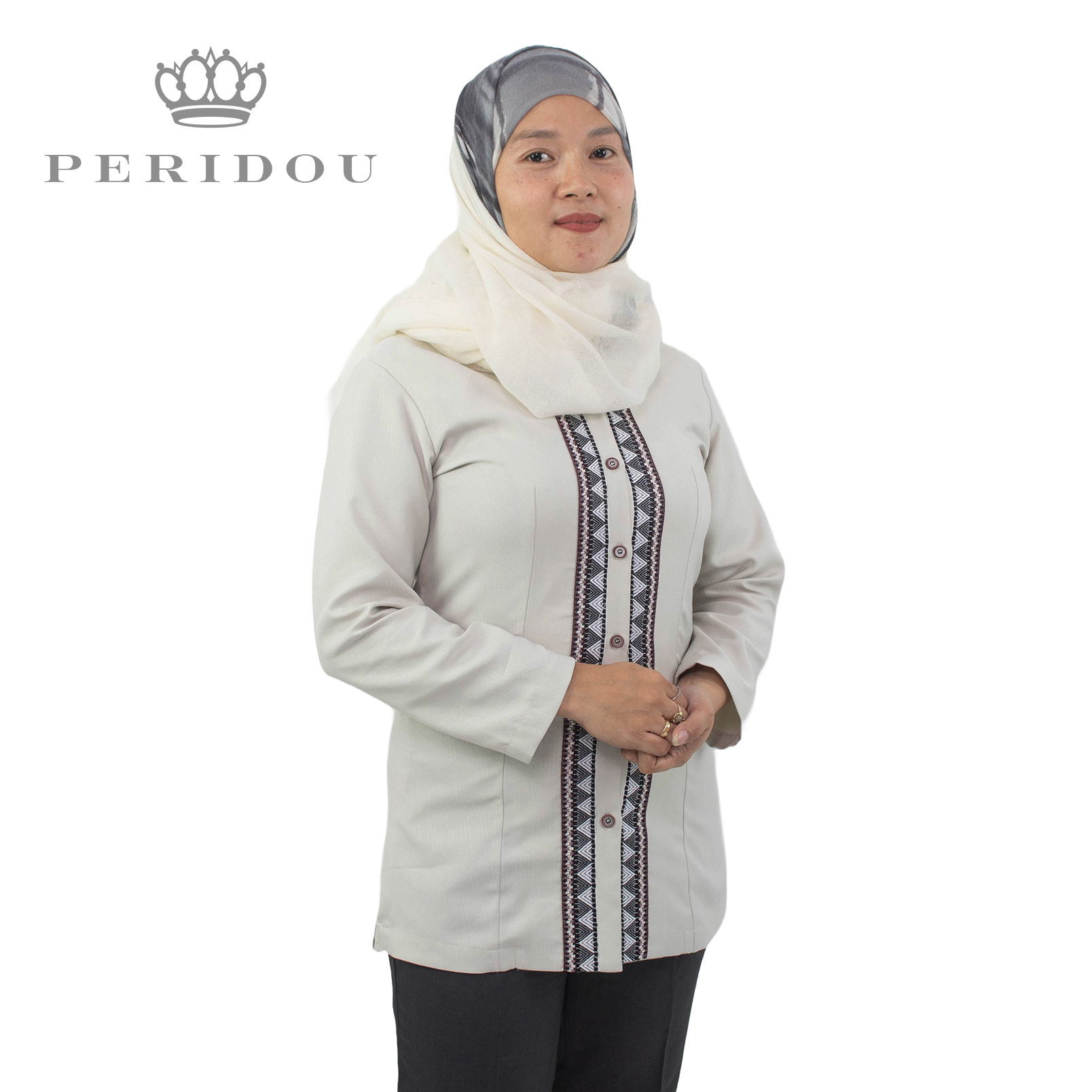 Gender Neutral Filipiniana-inspired Long-Sleeved Blouse with ethnic detailing at the placket. High neckline and long tunic/blouse covers below the hips. Marshmallow bone white with muted stripe pattern. Soft, light and silky textured fabric that is cool to the skin and flattering on all body shapes and sizes.